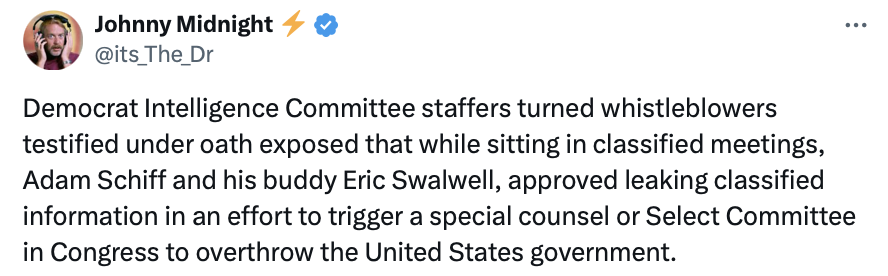 - Screenshot of a post by X account @its_The_Dr, which reads, "Democrat Intelligence Committee staffers turned whistleblowers testified under oath exposed that while sitting in classified meetings, Adam Schiff and his buddy Eric Swalwell, approved leaking classified information in an effort to trigger a special counsel or Select Committee in Congress to overthrow the United States government." It was posted as a repost of Trump's, which consisted of a clip from Fox News in which John Solomon says, in part, "This whistleblower literally sat in a meeting, he says, he tells the FBI, where Adam Schiff authorized the leaking of classified secrets to dirty up Donald Trump and to try to build towards either a select committee in Congress or a special prosecutor."