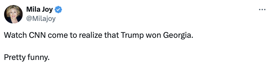 - Screenshot of X account @Milajoy saying "Watch CNN come to realize that Trump won Georgia. Pretty funny." posted alongside a repost of Trump's that consisted of a clip from CNN's election-night coverage in 2024.